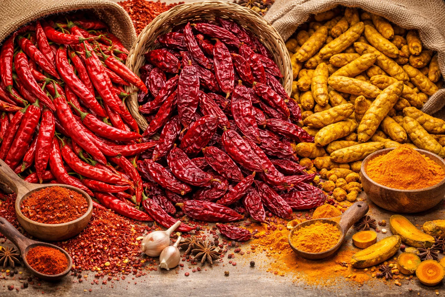 Premium dried whole red chillies with bold pungency and rich color. Hand-sorted and stemless to guarantee the finest visual and taste profile.